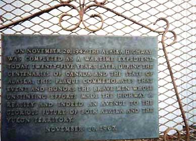 ON THIS SITE ON 1 APRIL 1946 THE UNITED STATES ARMY OFFICIALLY HANDED OVER THE ALASKA HIGHWAY AND ASSOCIATED FACILITIES TO THE MEMBERS OF THE NORTHWEST HIGHWAY SYSTEM JUNE 1956