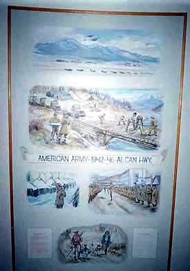 This mural depicts the original construction of the Alaska Highway by the United States Army Engineers.