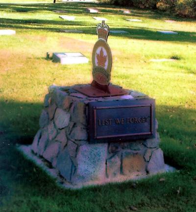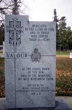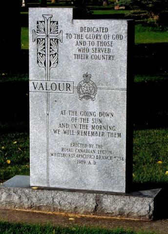 This memorial is dedicated to all those who fought for Canada. When the City of Whitehorse established this area lots were allocated to Masonic Lodge, Yukon Order of Pioneers, Elks and Legion. Each club was allowed to identify their area by installing an emblem. Their emblem identifies the Legion plot of land.