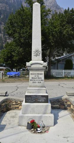 Six of the men on the cenotaph are from the 54th Kootenay Battalion and of those, five were from the original group of 17 who signed up together. When these 17 men left Hedley on August 24, 1915, they gathered at the exact location of the future cenotaph and had a group photo taken. There was a big send-off. All the townspeople gathered, the children were let out of school and the town brass band played. The recruits left Hedley in a caravan of vehicles draped with banners which read, "Recruits from Hedley, the Machine Gun Town."
