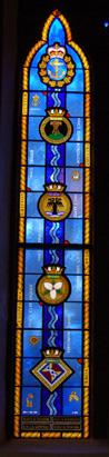 This stained glass window, Sailor’s Window of Remembrance, at St. Paul’s Anglican Church is a set of 3 memorial windows. After The Royal Canadian Navy Centennial Memorial Window (NICMM #59005-063), an Official Naval Centennial Project was dedicated in 2010, the donations left over were sufficient to create a second set of 3 smaller windows for the church. These windows were unveiled in 2011, dedicated to the sailors of the RN, the RFA, and the RCN who have given their lives in the service of their countries.