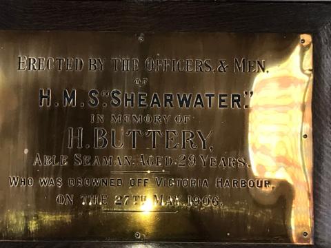This memorial is dedicated to H. Buttery. It was erected by the officers and men of Her Majesty's Ship (HMS) "Shearwater".