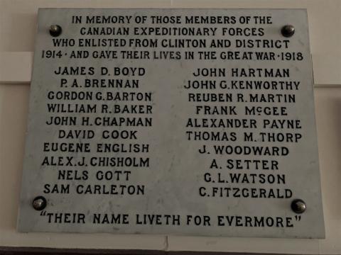 Constructed in 1920 (approx.) in memory of members of the Canadian Expeditionary Forces who enlisted from Clinton and District. The Clinton Memorial Hall was built by the residents of Clinton in the early 1920's as a memorial to World War I forces. All labour and material were donated. The hall is still used today and is maintained by the village of Clinton. The monument is inside the hall and is used each year at Remembrance Day ceremonies on November 11th.