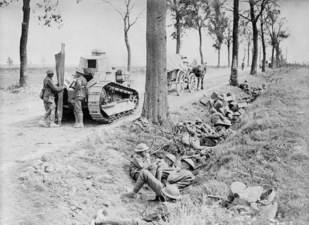 Canadian troops taking cover in a ditch alongside the road to Cambrai during "Canada's 100 Days."