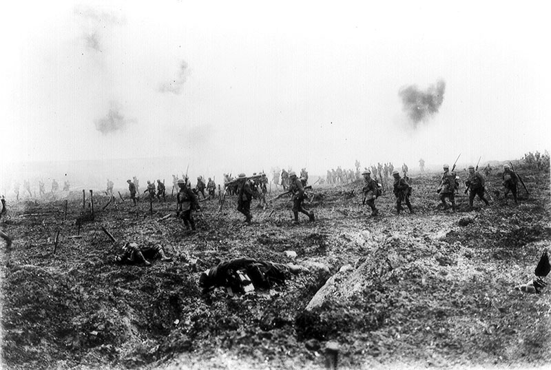 Canadian soldiers advancing at Vimy Ridge.