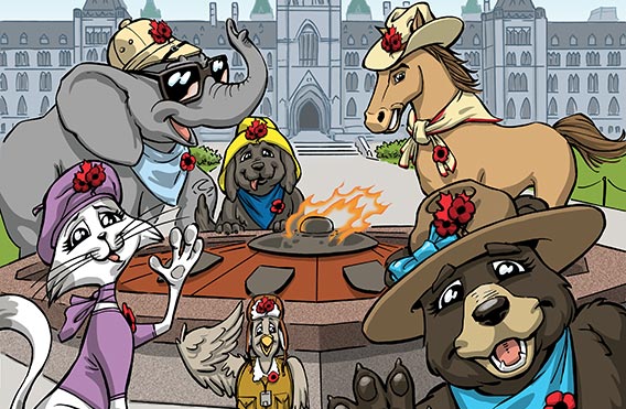 “My Remembrance Clubhouse animal friends and I are back in Ottawa for a very special reason,” barked Gandy the dog. “This year, the National War Memorial is being rededicated to the memory of Canadians who fought for our country in every conflict!”
