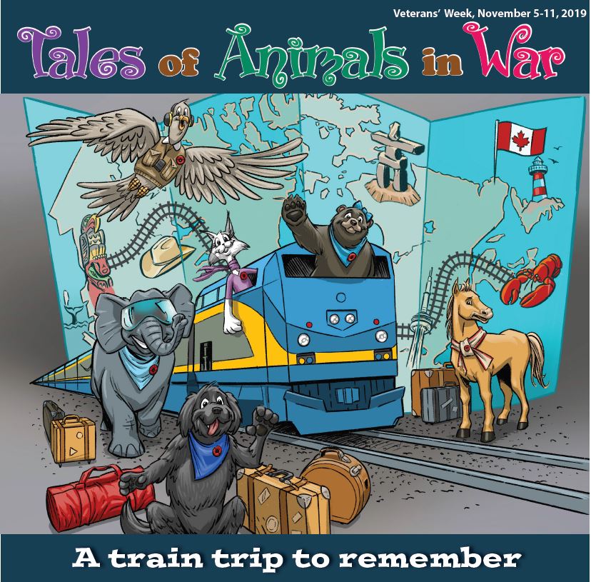 “Did you know that train travel is another Canadian tradition? Before the days of airplanes and cars, railway tracks brought us together as a nation. In fact, trains were often used to transport Canadian soldiers across our vast land to the East Coast. There they would board troop ships to head overseas during times of war,” growled Win the bear.
