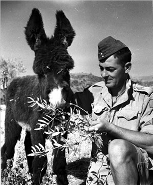 Private P.T. Leachman with the donkey mascot of the Saskatoon Light Infantry.