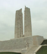 Canada's most impressive tribute overseas to those Canadians who fought and gave their lives in the First World War is the majestic and inspiring Vimy Memorial, which overlooks the Douai Plain from the highest point of Vimy Ridge, about eight kilometres northeast of Arras on the N17 towards Lens. The Memorial is signposted from this road to the left, just before you enter the village of Vimy from the south. The memorial itself is someway inside the memorial park, but again it is well signposted. At the base of the memorial, these words appear in French and in English: