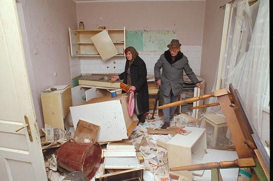 Un couple de vieillards serbes réfugiés cherche des effets personnels dans leur maison détruite. Photo : Ministère de la Défense nationale