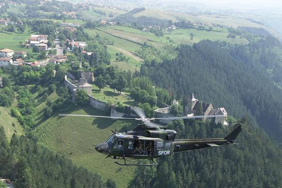 Un hélicoptère CH146 Griffon du 408e Escadron d'hélicoptères tactiques de la BFC Edmonton survole les ruines d'un ancien château, près de Velika Kladusa (Bosnie-Herzégovine), avec la force d'intervention rapide à son bord. Photo : Ministère de la Défense nationale