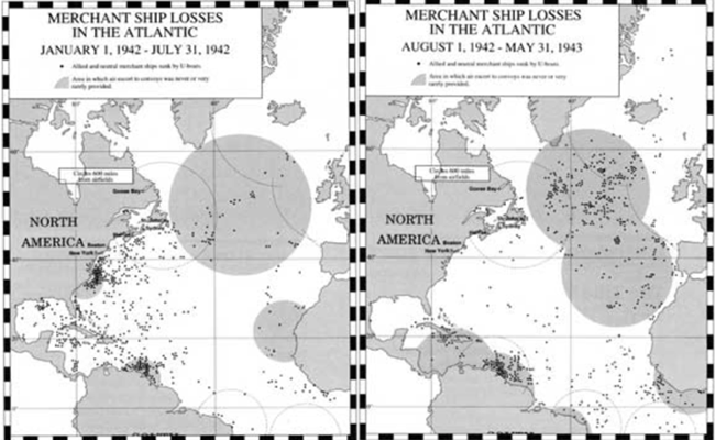 Plus de 25 000 voyages furent effectués entre les ports nord américains et britanniques sous escorte des forces canadiennes. Ce fut sans conteste l’une des plus importantes réalisations de la bataille de l’Atlantique. Ces navires ont acheminé approximativement 165 millions de tonnes de fret au Royaume-Uni, et ont contribué à la libération de l’Europe. De leur côté, les navires de guerre et les avions canadiens ont détruit quelque 50 sous marins allemands ou aidé à leur destruction.