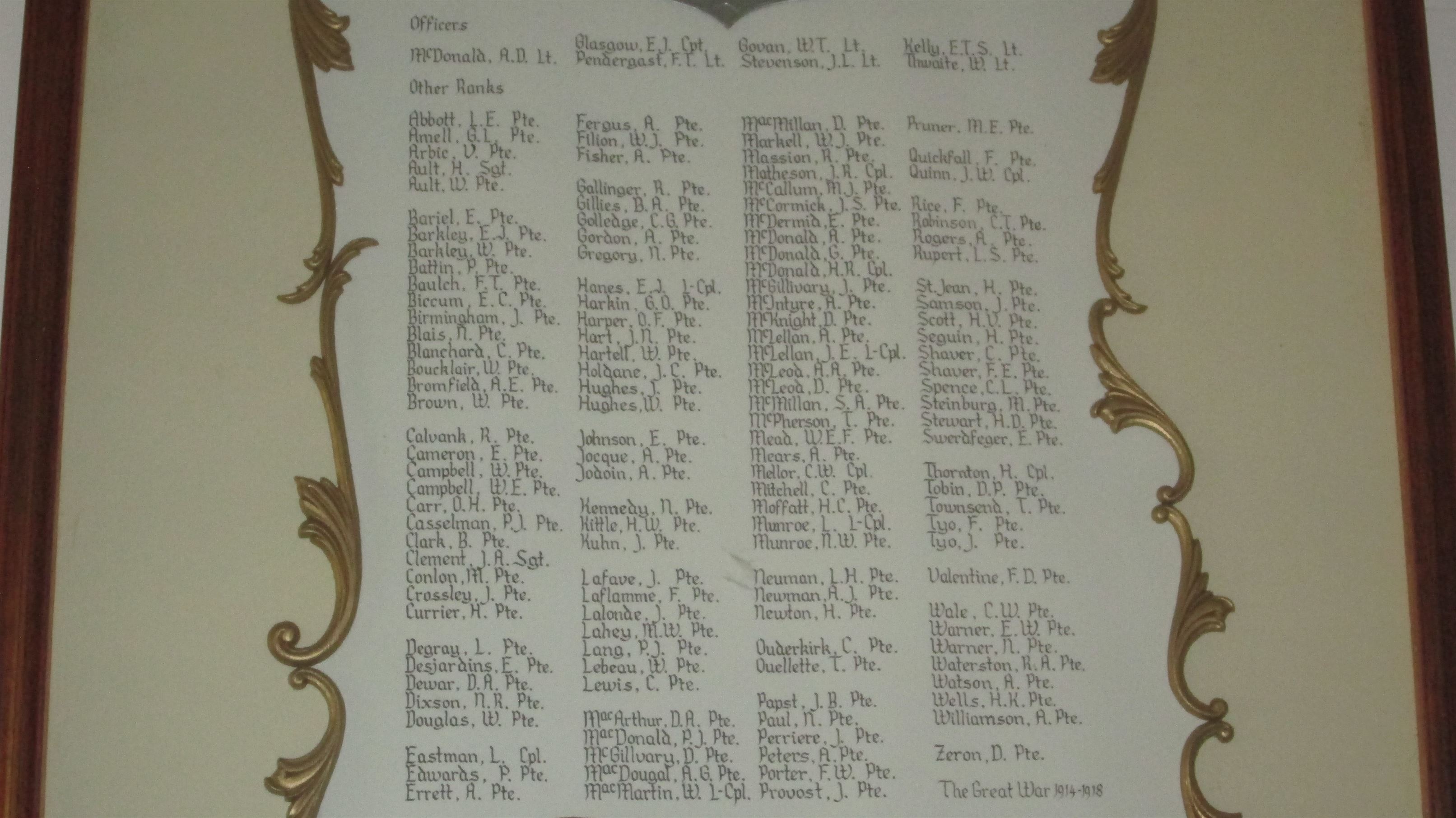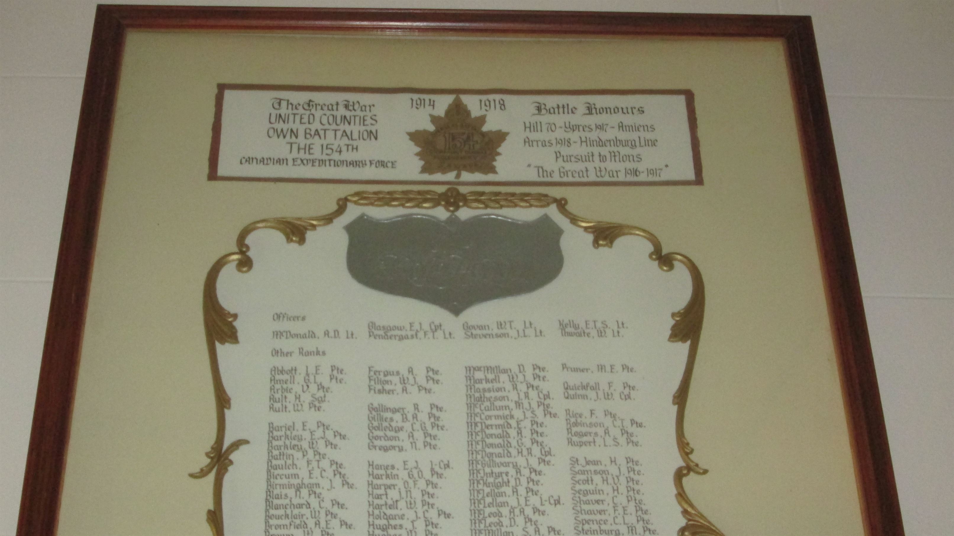 Ce parchemin a été dévoilé à la mémoire des soldats du 154e bataillon de la Force expéditionnaire canadienne qui sont décédés pendant la Première Guerre mondiale.