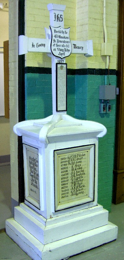 À l’origine, ces monuments ont été érigés sur la crête de Vimy par le 46e Bataillon, en 1917. Ils ont été rapatriés au Canada et placés dans la St. John’s Anglican Church, à Moose Jaw, en Saskatchewan, le 25 mai 1930. Ils ont ensuite été transportés au manège militaire David Currie, V.C., où ils sont exposés depuis.