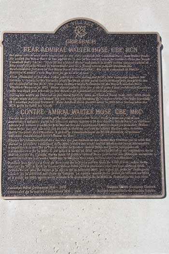 Aucun officier de marine n’a eu plus d’importance dans les premières années de la Marine canadienne que Walter Hose. Celui-ci s’est enrôlé dans la Royal Navy à 14 ans, puis est passé à la Marine royale du Canada (MRC). Il a pris le commandement du NCSM RAINBOW, le premier navire canadien à aller à la guerre en mer. Il était commandant des escortes de patrouille sur la côte Est durant la première campagne de la MRC contre les sous-marins allemands. Sa vision a mené à la formation de la Réserve des volontaires de la Marine royale du Canada en 1923 et à l’adoption d’une politique navale qui a entraîné la construction de navires de combat au Canada et qui a mis l’accent sur la défense des eaux territoriales. Walter Hose est devenu plus tard directeur du Service naval et Chef d’état-major de la Marine (1921-1934). Il a mené de nombreux combats pendant les années de la Grande Crise afin d’assurer la survie de la MRC naissante. Le Contre-amiral Hose a pris sa retraite en 1933 et s’est éteint en 1965 après avoir assisté au développement de la MRC conformément à sa vision.