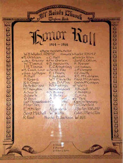 Ce tableau d'honneur porte les noms de tous les membres de la congrégation de l'Église anglicane All Saints qui ont combattu dans les forces pendant la Première Guerre mondiale.