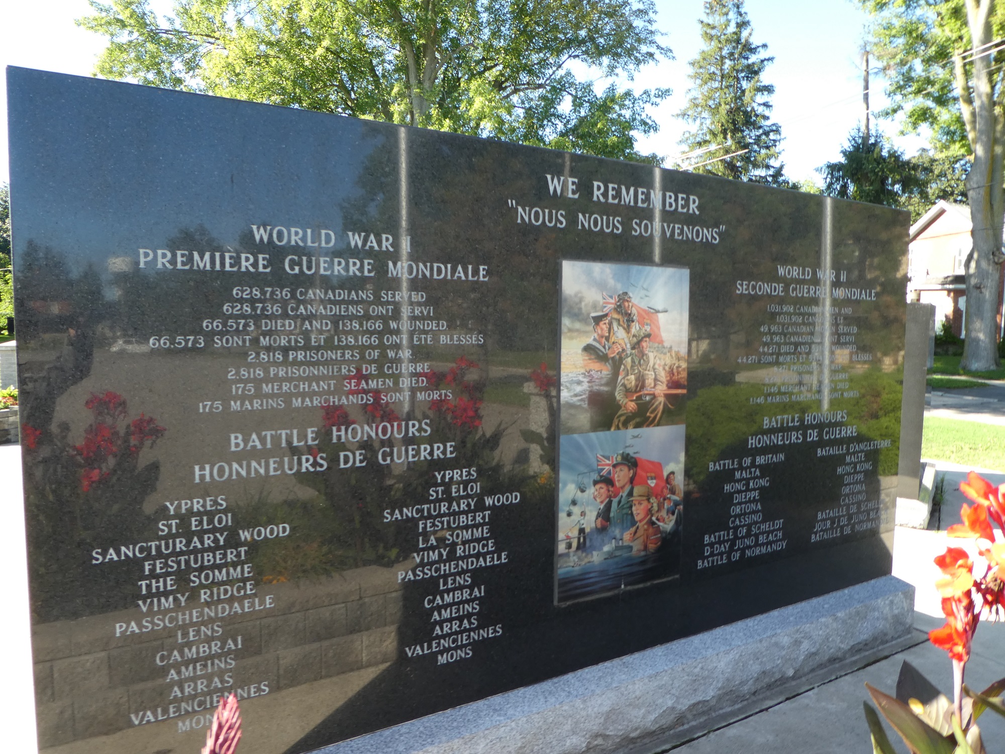 La pièce maîtresse du monument a été dévoilée le 24 août 2013. Les fonds ont été fournis par la Nottawasaga Foundation et il a été conçu par Bradley Design Consultants de New Tecumseth. Il a été construit par Smith Monuments Company Ltd. La pierre centrale est en granit Cambrian Black du Québec, et sur le devant figurent les noms des soldats qui ont fait le sacrifice ultime lors des Première et Seconde Guerres mondiales. La liste des combattants des deux guerres est indiquée au dos.
