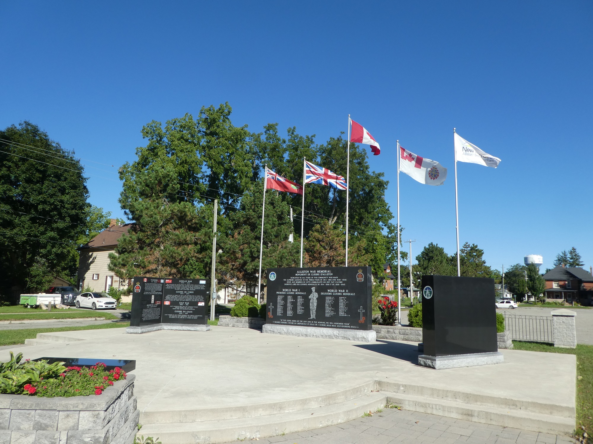 En 2008, un comité a été créé pour construire un cénotaphe en l’honneur des vétérans de la région. Le choix du coin de l’avenue Albert et de l’avenue Paris s’explique par le fait qu’il est adjacent à l’Alliston Memorial Arena, qui a été nommé en l’honneur des vétérans de la région en 1950, et par le fait qu’il est au centre de la ville. Le territoire appartient aux Wendats, aux Haudenosaunees et aux Chippewas/Ojibwés.