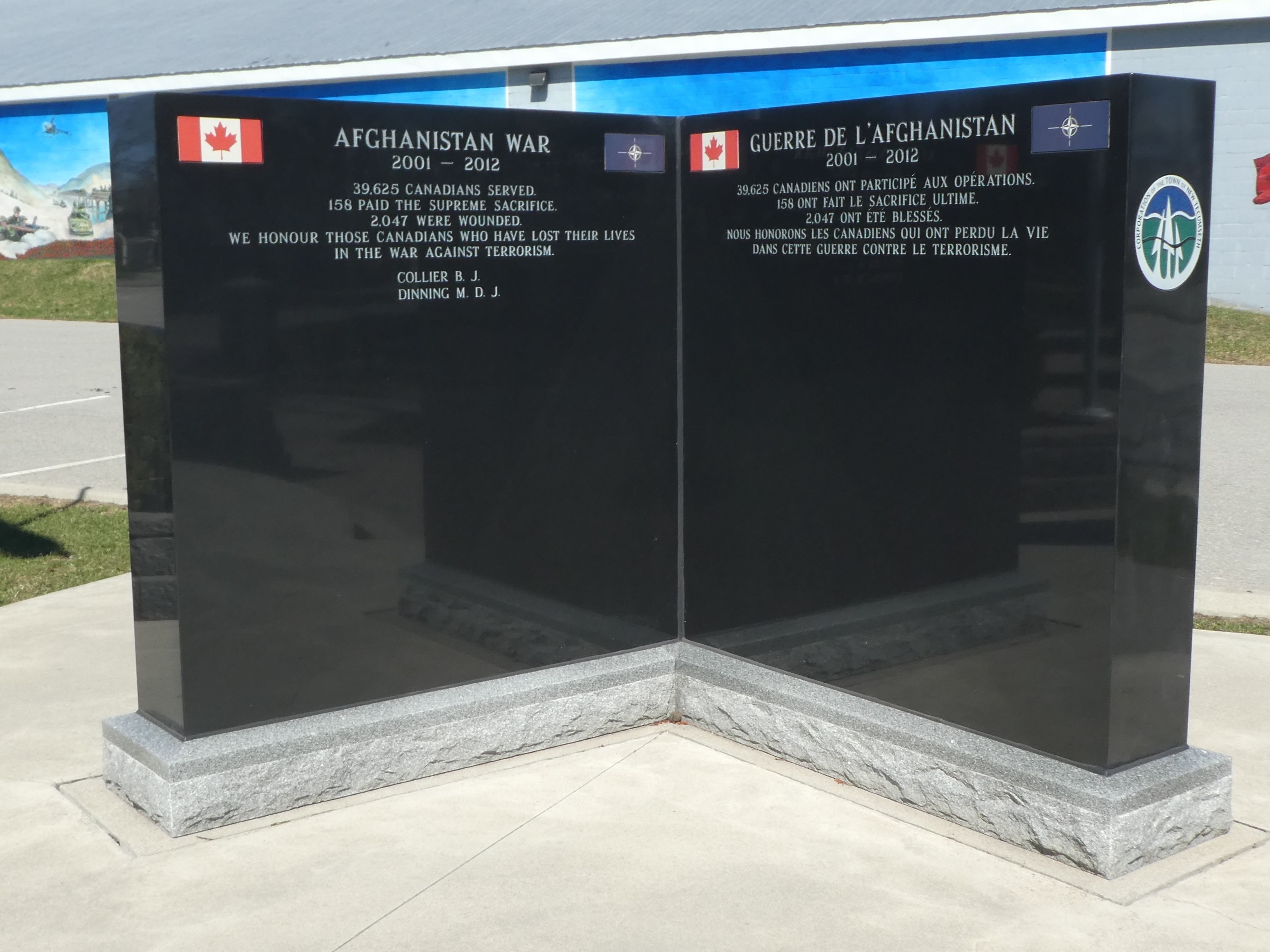 L’œuvre honorant les militaires a été réalisée par l’artiste David Craig. Les monuments commémoratifs des ailes sont fabriqués à partir de pierre noire suprême d’Inde. Sur le côté ouest se trouvent des consécrations des vétérans de la Corée, de la guerre du Golfe et de missions de maintien de la paix. Le côté est rend hommage aux vétérans qui ont servi en Afghanistan.