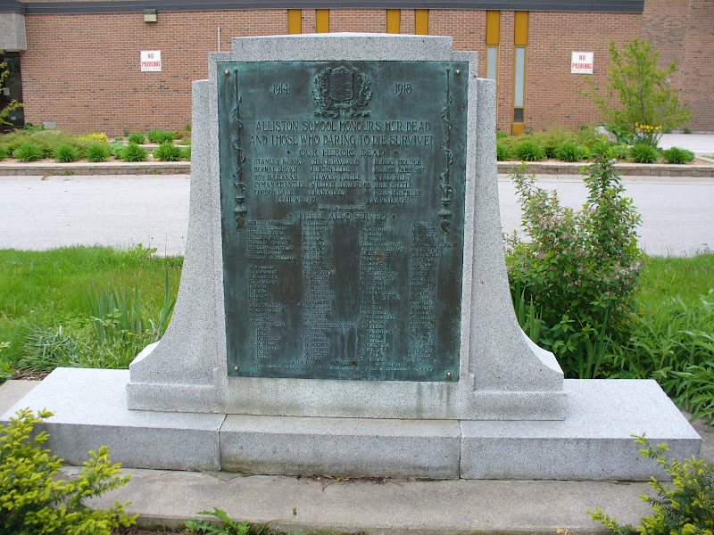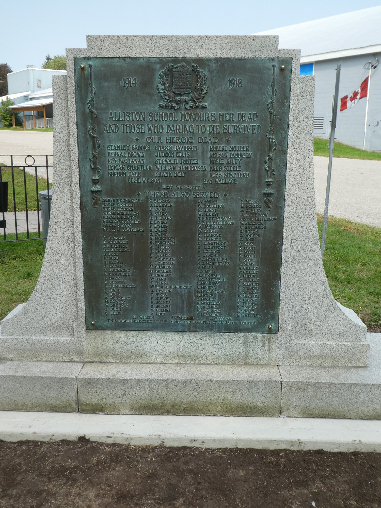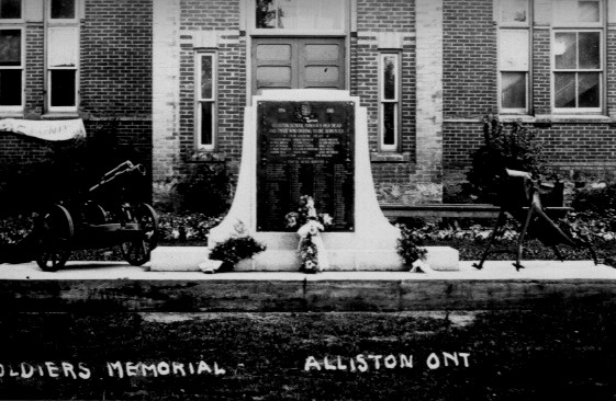 En août 1920, le conseil municipal d’Alliston a organisé un comité pour recueillir des fonds et concevoir un monument de la Première Guerre mondiale. Le public et le personnel de l’école secondaire ont proposé d’ériger un monument aux anciens élèves de l’école, les frais étant couverts par les élèves actuels et les anciens. L’école publique et secondaire d’Alliston au 25, rue Albert Ouest a été choisie comme site. En trois mois, plus de 800 $ ont été amassés pour le projet.