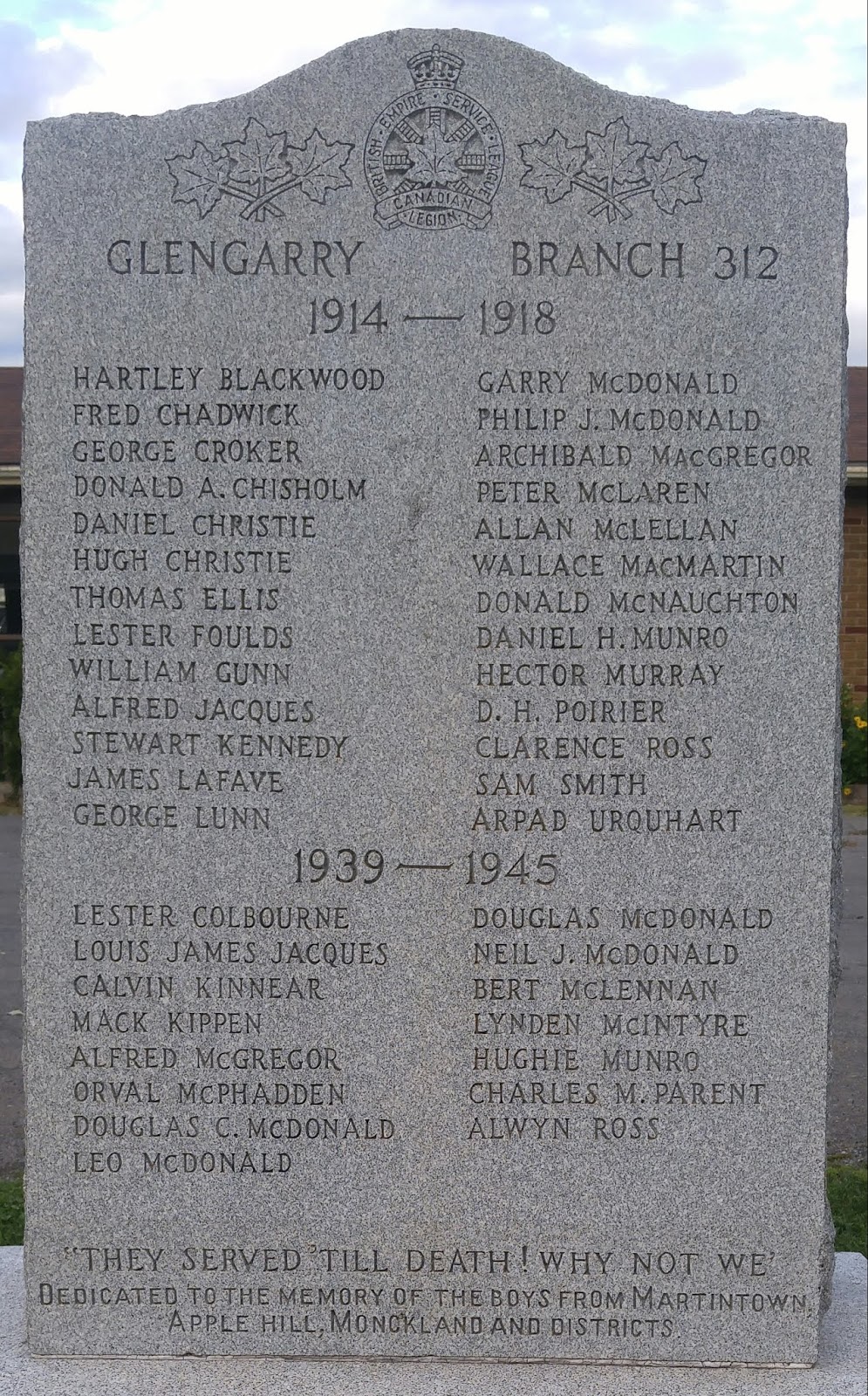Le cénotaphe d’Apple Hill a été érigé par la filiale no 312 de Glengarry de la Légion royale canadienne à la mémoire des habitants de Martintown, Apple Hill et de Monkland ayant perdu la vie au cours de la Première Guerre mondiale et de la Seconde Guerre mondiale. Plus tard, une plaque a été ajoutée pour la guerre de Corée.