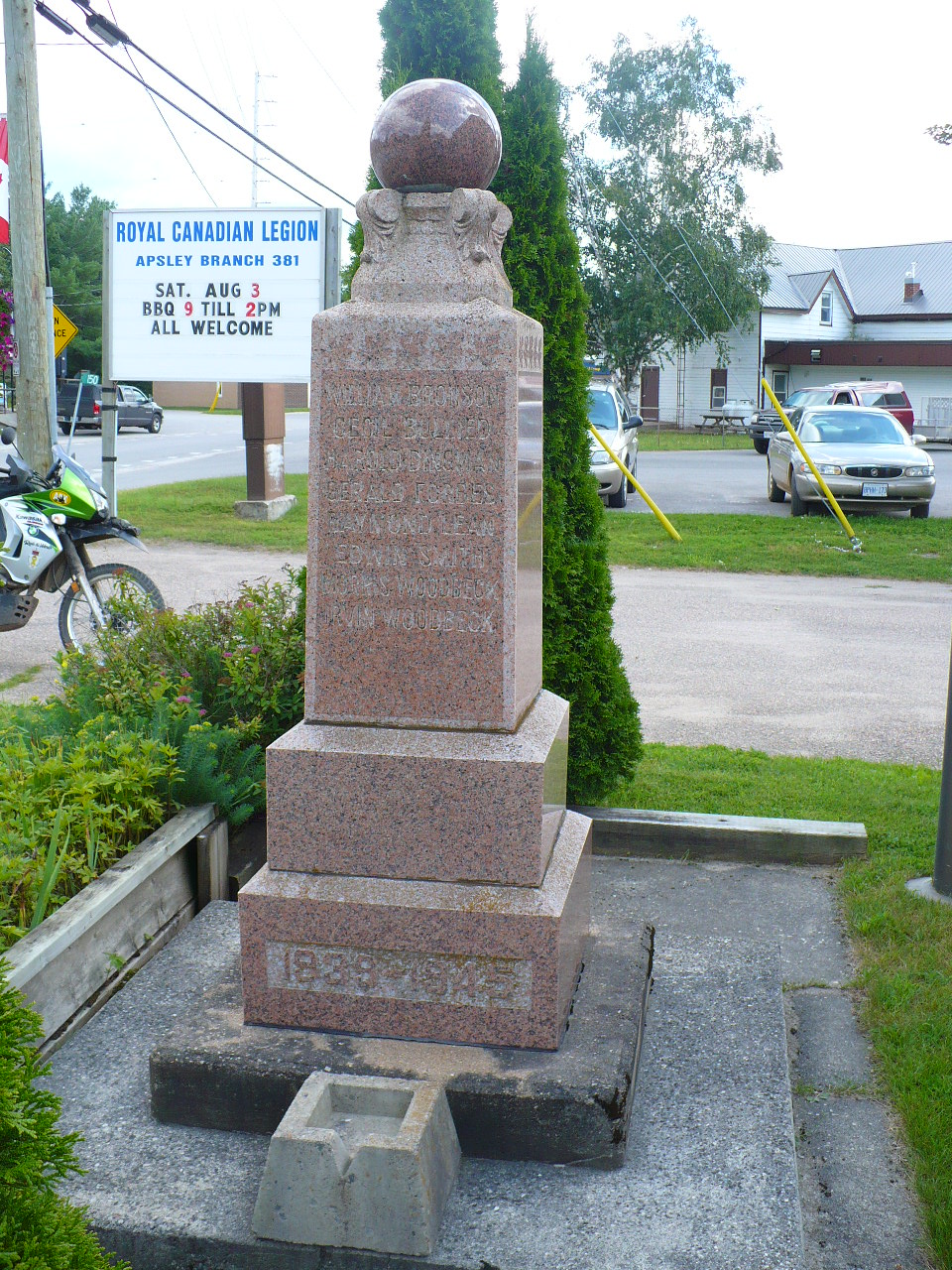 En 1936, le cénotaphe a été relocalisé devant le vieux bâtiment municipal (lieu actuel de la Banque Royale et de la banque alimentaire Apsley). Il a été déplacé à nouveau en 1951 à son emplacement actuel devant la filiale no 381 de la Légion royale canadienne. Après la Seconde Guerre mondiale, les noms de huit soldats qui ont perdu la vie pendant cette guerre ont été ajoutés au cénotaphe.