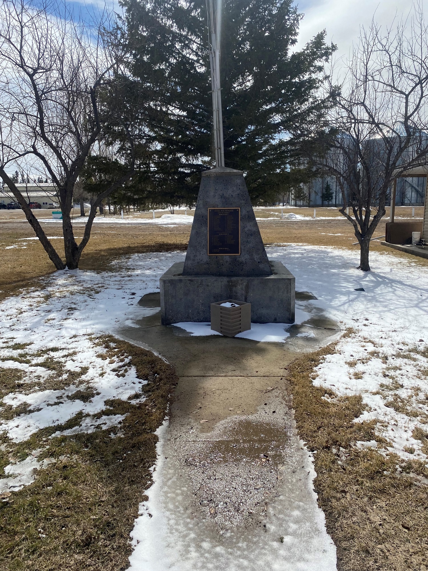 La forme traditionnelle du cairn est recouverte d’un revêtement en béton. Sur la plaque de bronze sont inscrits les noms de 26 vétérans de la Première Guerre mondiale (incluant une infirmière) et de 15 vétérans de la Seconde Guerre mondiale. Les noms de trois vétérans de la Première Guerre mondiale qui manquaient ont été ajoutés par la suite.