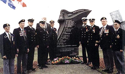 Description de la 4e photo: La filiale Joseph Keable VC à Rimouski, Québec, a commémoré la bataille de l'Atlantique avec des membres du NCSM Iberville. Cette photo montre la présence de (gauche à droite) Pierre Parent, Valmont Bouchard, Eric Girouard, Jacques Guay, Maurice Allard, Raynald Tremblay, Roger Tremblay, Serge Quenneville, Jean Thériault et Gilles Dionne au cénotaphe de Rimouski. La source de cette photo est inconnue.
