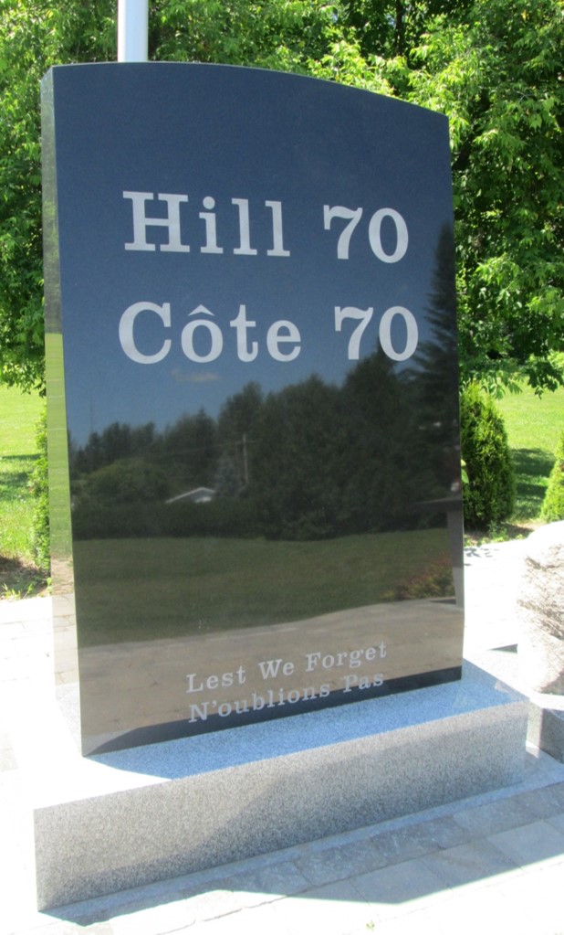 La bataille de la Côte 70 a été souvent désignée lade la Première Guerre mondiale 1914-1918. Contrairement célèbres batailles où les soldats canadiens ont pris part, comme la crête de Vimy et à Passchendaele, aucun monument a été érigée pour commémorer les événements entourant cette bataille. Il n’existe qu’un seul monument spécifiquement désigné pour rappeler cette importante victoire canadienne; il est situé dans la communauté de «Mountain» en Ontario.