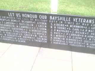 Du côté ouest du cénotaphe, dans une dalle de granit noir poli faisant 10 pi (de longueur) par 18 pi (de hauteur), sont gravés les noms des vétérans de Baysville qui répondirent à l’appel, de ceux qui revinrent, et de ceux qui ne reviendraient jamais à la maison. Ce mur est positionné de façon à être le premier à recevoir les rayons du soleil au lever du jour. Le cénotaphe est aujourd’hui doté de deux mâts pour hisser les drapeaux du Canada et de l’Union Jack. La nuit, les drapeaux et le pilier central du cénotaphe sont éclairés.