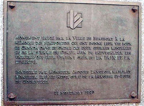 MONUMENT ÉRIGÉ PAR LA VILLE DE BEAUPORT À LA MÉMOIRE DES BEAUPORTOIS QUI ONT DONNÉ LEUR VIE POUR LE CANADA DANS LE CADRE DES DEUX GUERRES MONDIALES ET DE LA GUERRE DE CORÉE, AFIN DE SAUVEGARDER LES VALEURS QUI LEUR ÉTAIENT CHÈRES: LA PAIX ET LA LIBERTÉ.