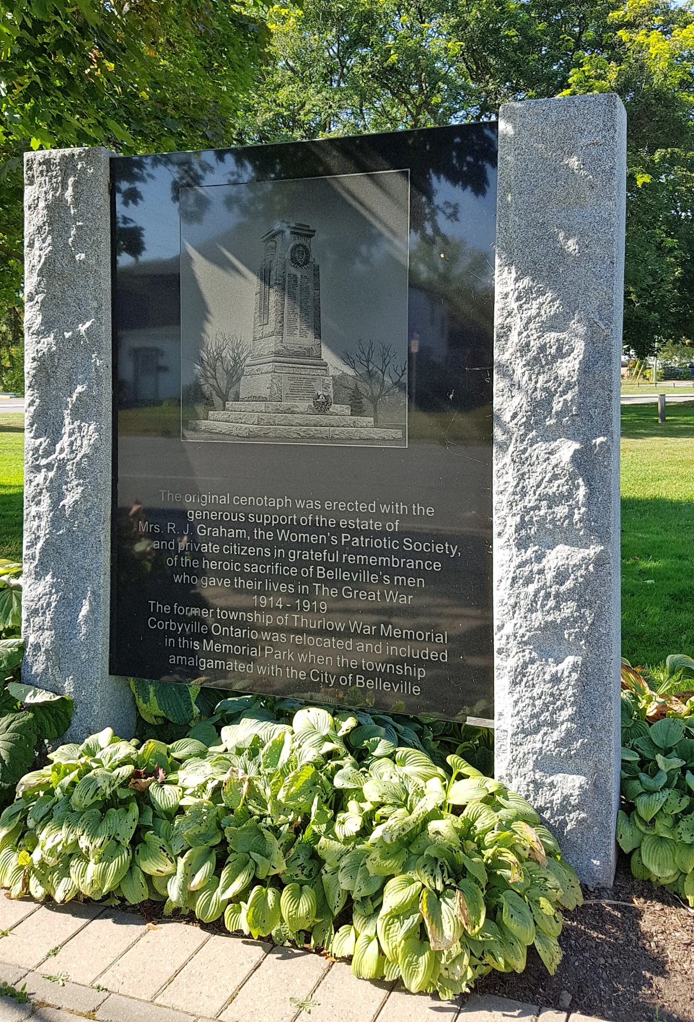 ERECTED BY MRS. R.J. GRAHAM ESTATE, WOMEN'S PATRIOTIC SOCIETY OF BELLEVILLE AND PRIVATE CITIZENS IN GRATEFUL REMEMBRANCE OF THE HEROIC SACRIFICE BY THE MEN OF BELLEVILLE WHOSE NAMES APPEAR HEREON WHO GAVE THEIR LIVES FOR OUR EMPIRE IN THE GREAT WAR.