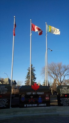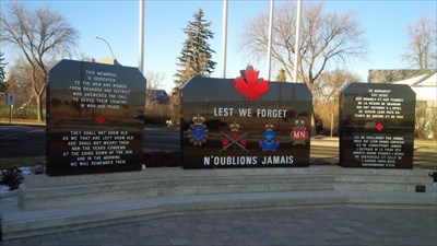 Ce monument commémoratif est composé de trois stèles de granit posées sur un socle de calcaire dolomitique et de béton. La feuille d’érable du Canada et les insignes de la marine, de l’armée de terre, de la force aérienne et de la marine marchande sont gravés sur la face de la plaque du centre, qui porte l’inscription « LEST WE FORGET / N’OUBLIONS JAMAIS ». On trouve gravés au dos de cette stèle l’insigne de la ville de Brandon et des tiges de blé symbolisant la Ville du blé.