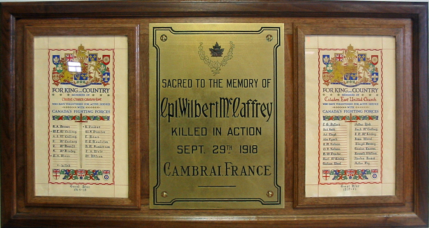 Caledon East United Church First World War Honour Roll, Corporal Wilbert McCaffery Plaque, Caledon East United Church Second World War Honour Roll.