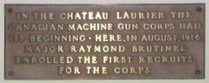 Ce monument commémoratif consiste en un groupe de trois plaques suspendues au même mur, l’une en dessous de l’autre. Sur la grande plaque se trouve un « bas-relief » circulaire du buste du Brigadier-général Brutinel et un « bas-relief » représentant des mitrailleurs sur la crête de Vimy. Les plaques ont été produites en l’honneur des membres du Corps canadien de mitrailleuses qui sont morts en service actif ainsi que de tous ceux qui ont servi. Elles sont aussi dédiées à la mémoire du Brigadier-général R. Brutinel, CB, CMG, DSO, qui commandait le Corps canadien de mitrailleuses. En août 1914, le Major Raymond Brutinel a enrôlé les premières recrues du Corps, ici même, au Château Laurier.
