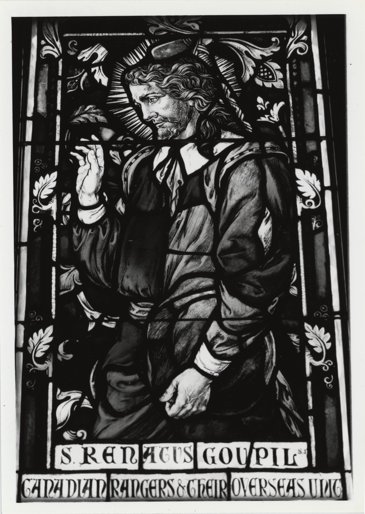 Au-dessus de la porte principale de la chapelle se trouve un vitrail dédié aux martyrs canadiens, un don des Irish Canadian Rangers survivants, érigé au moment de la construction de la chapelle, à la mémoire des officiers et des hommes du régiment. Il s’agit d’une œuvre de Charles William Kelsey de Montréal. Les grands panneaux centraux et deux des petits panneaux centraux de ce vitrail représentent les huit martyrs. Le panneau supérieur gauche représente le sceau de l’Ordre des Jésuites, le panneau supérieur droit est l’insigne régimentaire des Irish Rangers, tandis que les deux panneaux d’angle inférieurs sont les armoiries des branches Loyola et Oñaz de la famille de Saint Ignace, fondateur des jésuites, qui ont été combinées de diverses manières au fil des ans pour former l’écusson non officiel du Collège Loyola.