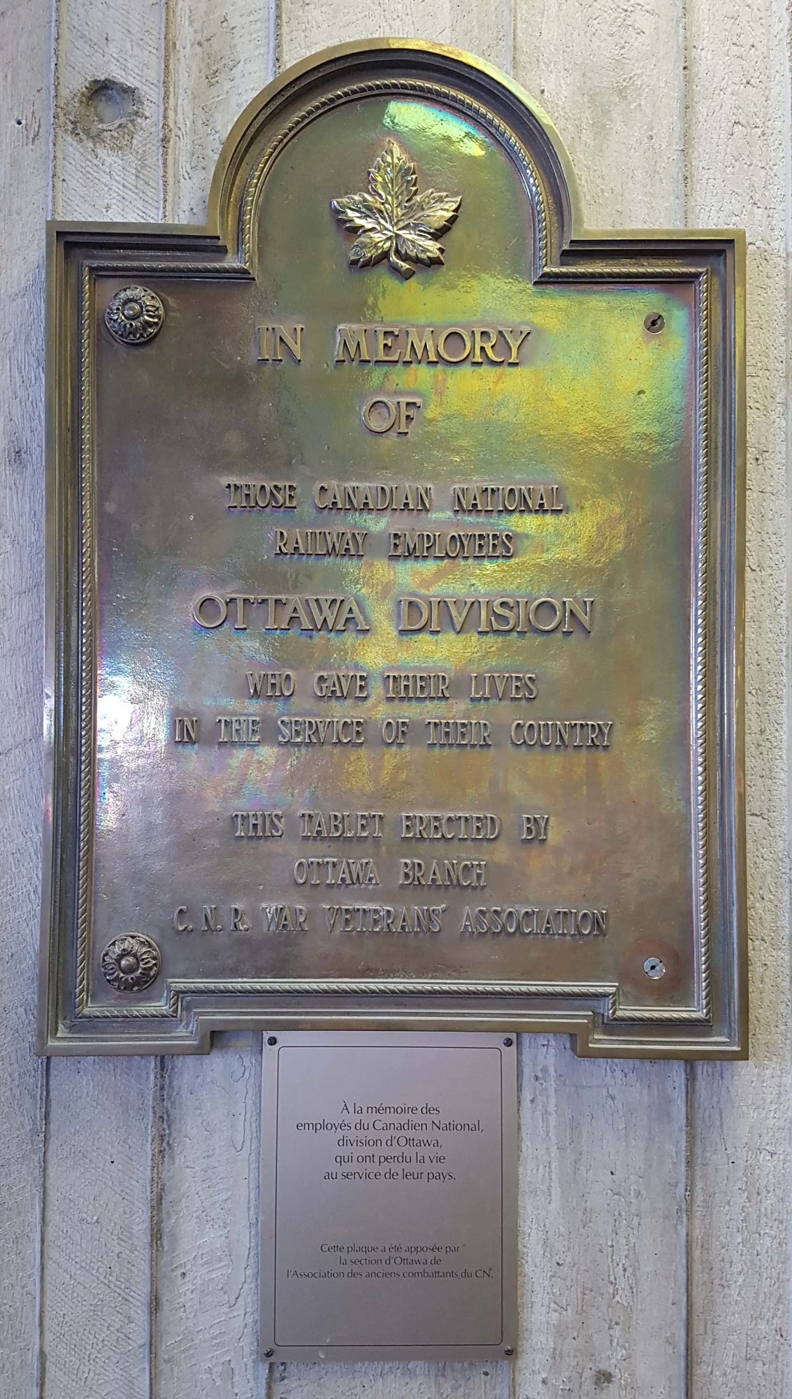 A plaque dedicated to Canadian National Railway employees of the Ottawa region who gave their lives in the service to their country was unveiled at Union Station on Sunday 8 November 1953. It was erected by the Ottawa Branch, Canadian National Railway War Veterans’ Association.
