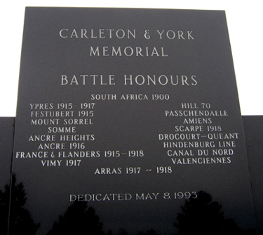 Ce mémorial est dédié aux membres du Carleton and York Regiment. Il a été érigé par l’association régimentaire.
