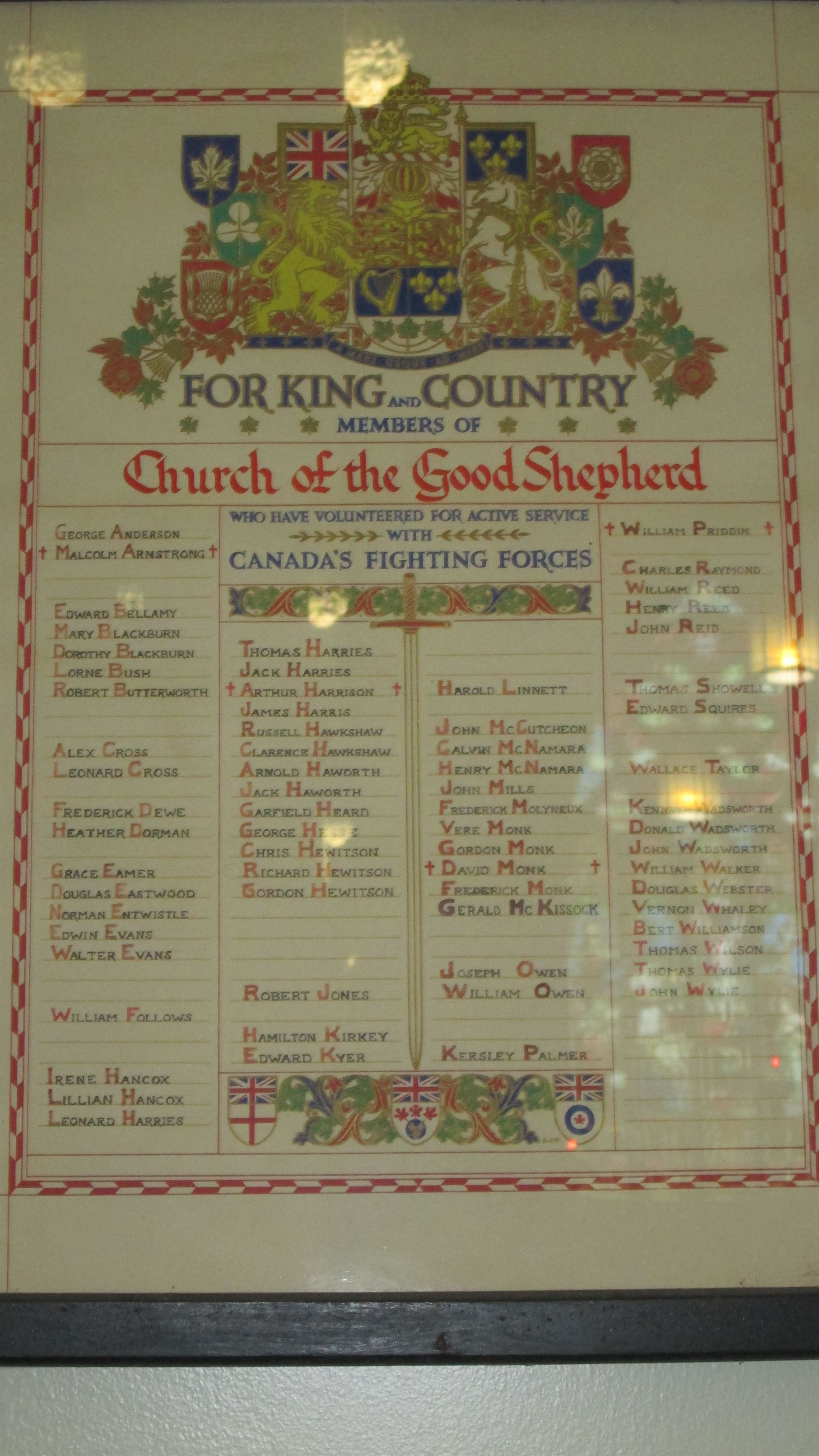 Ce parchemin a été dévoilé à la mémoire des membres décédés de la Chapelle du Bon Pasteur ainsi que de ceux et celles qui ont servi pendant la Seconde Guerre mondiale.