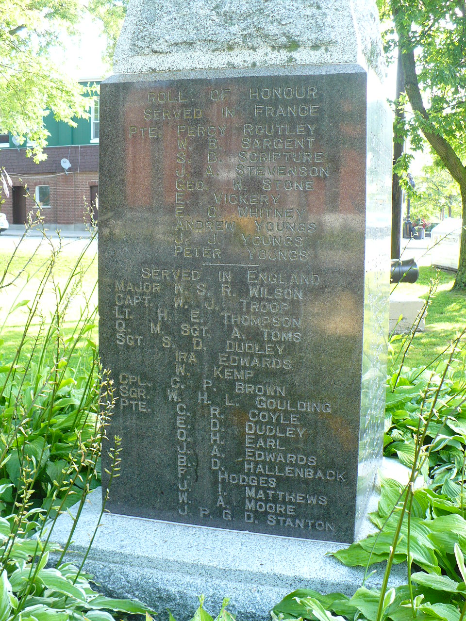 Il y a 113 noms d’inscrits sur le socle en granite de la sculpture « Le soldat canadien », pour rendre hommage à ceux qui ont été tués au combat ou en service ainsi qu’à 90 hommes de la région qui ont servi et ont survécu.