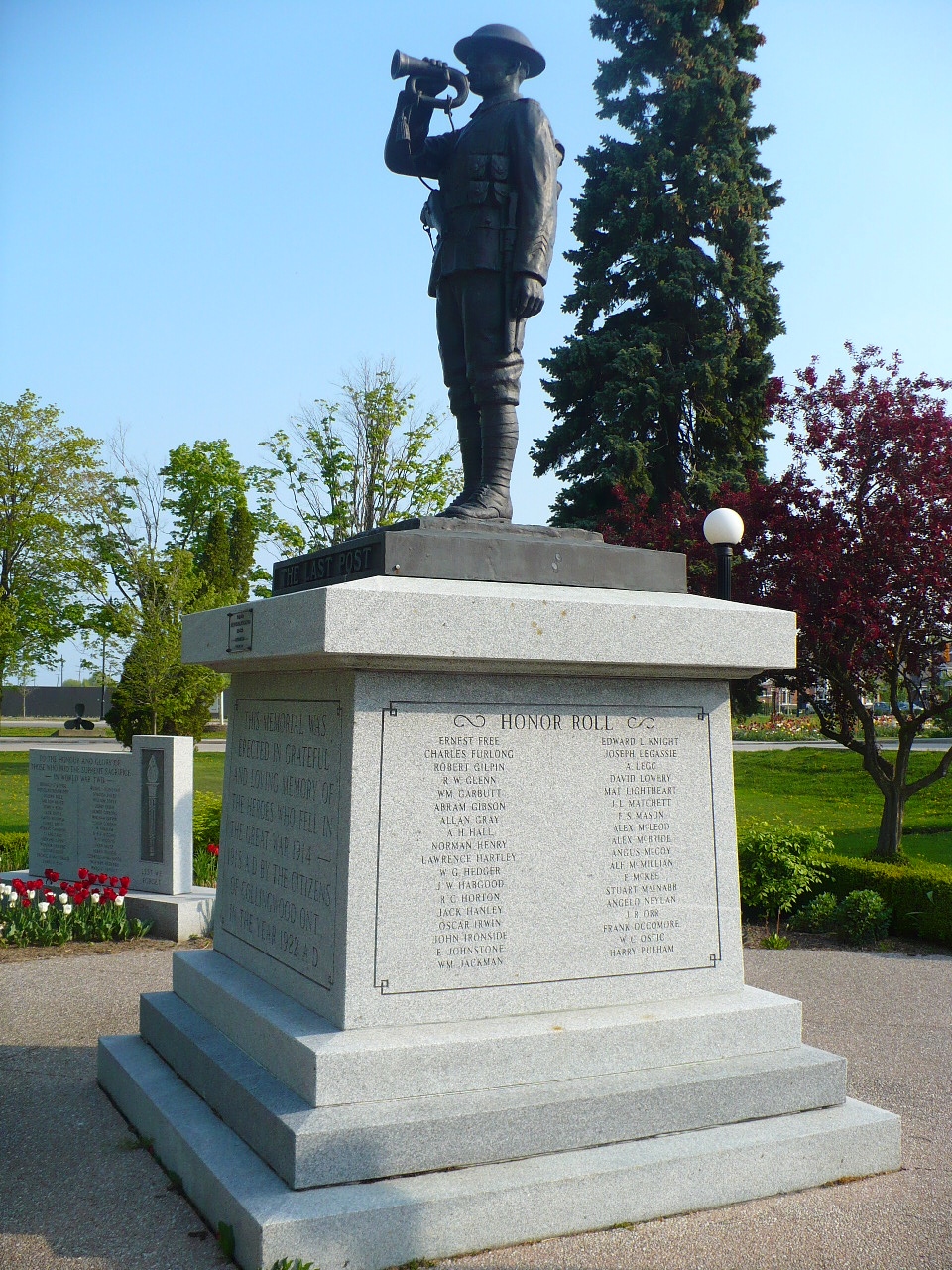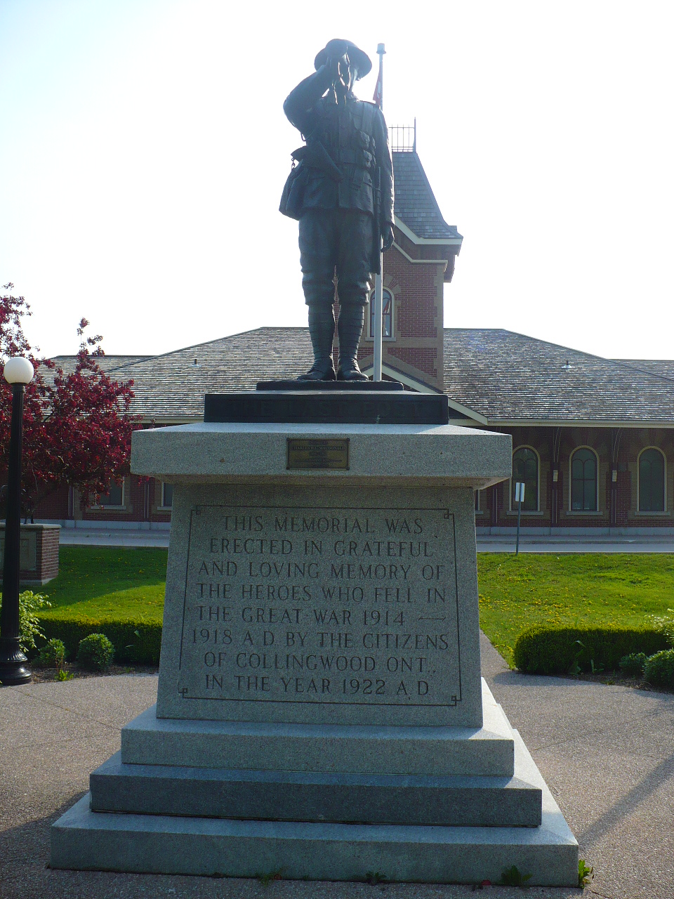 En 1923, le Canadien National a consenti à l’érection d’un mémorial sur sa propriété si la Ville était prête à signer une entente. La compagnie a également fourni les services d’un architecte paysagiste pour aider à établir le plan d’aménagement du mémorial. Le cénotaphe est dédié aux hommes de Collingwood qui se sont enrôlés et qui ont fait le sacrifice de leur vie pendant la Première Guerre mondiale. Les côtés nord et sud du socle portent les noms de ceux qui sont tombés au combat.