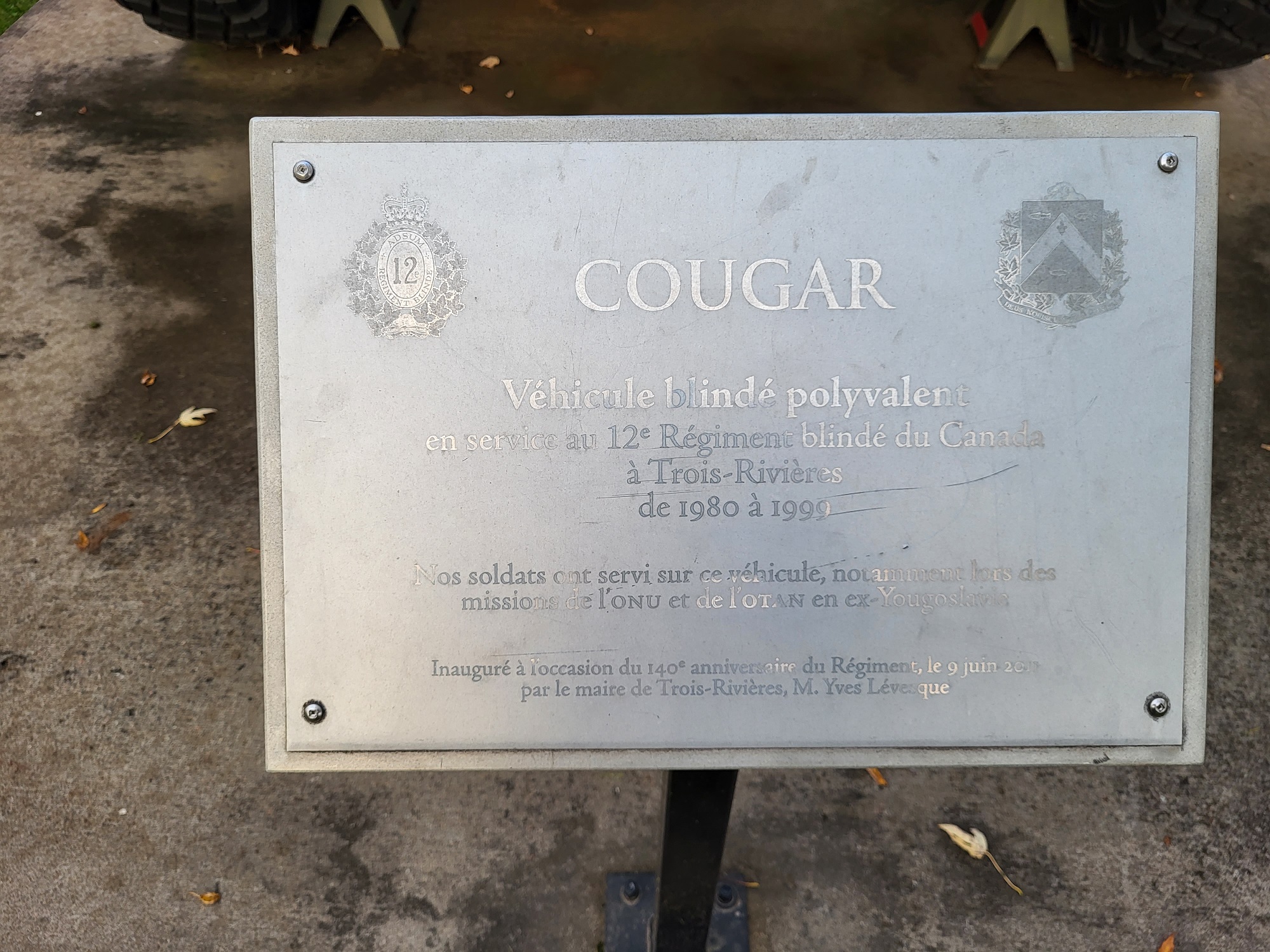 Le Cougar était un véhicule blindé utilisé par le Three Rivers Regiment de 1980 à 1999. Des soldats ont servi dans ce véhicule, lors de missions de l’ONU et de l’OTAN en ex-Yougoslavie. Il a été inauguré à l’occasion du 140e anniversaire du régiment, le 9 juin 2011.