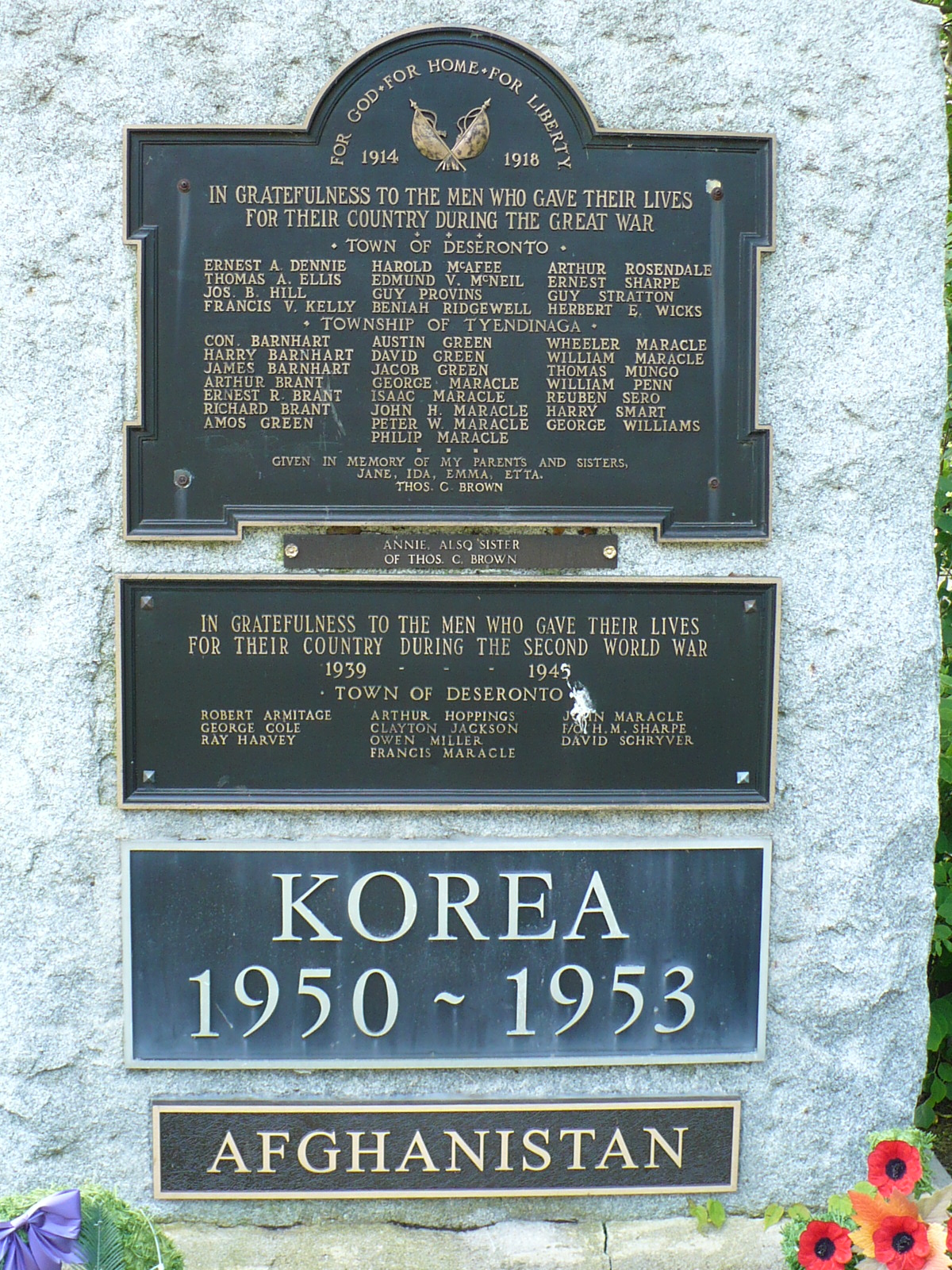 Thomas C. Brown a ensuite été sénateur au Sénat de New York entre 1925 et 1930, où il s’est intéressé de près aux questions relatives à la réforme des prisons. Il est clair qu’il n’a jamais oublié sa ville natale de Deseronto, comme en témoigne le don généreux d’un monument aux morts. Mais ce n’est pas seulement un monument commémoratif de guerre, car Thomas C. Brown a veillé à ce que les noms de ses parents et de cinq de ses sœurs (Jane, Ida, Etta, Emma et Annie) figurent également sur la structure.