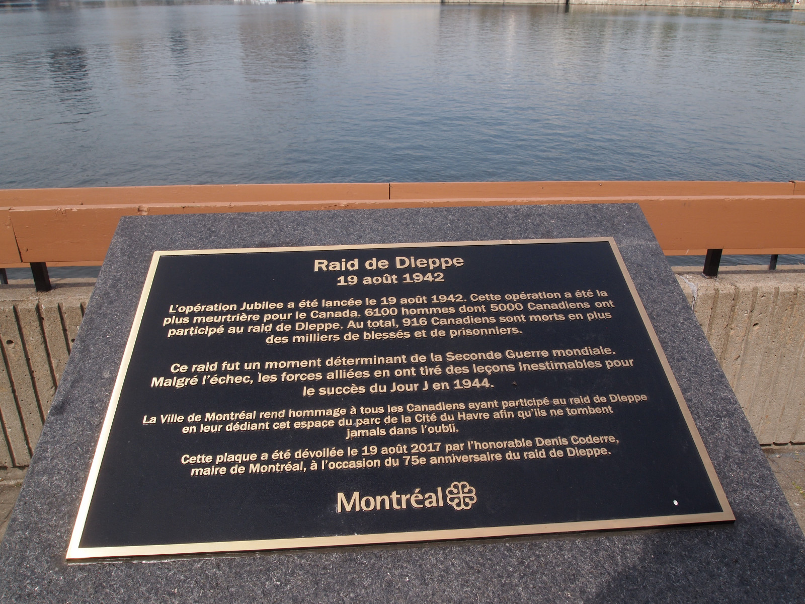 La Ville de Montréal rend hommage à tous les Canadiens ayant participé au raid de Dieppe en leur dédiant cet espace du parc de la Cité du Havre afin qu'ils ne tombent jamais dans l'oubli.