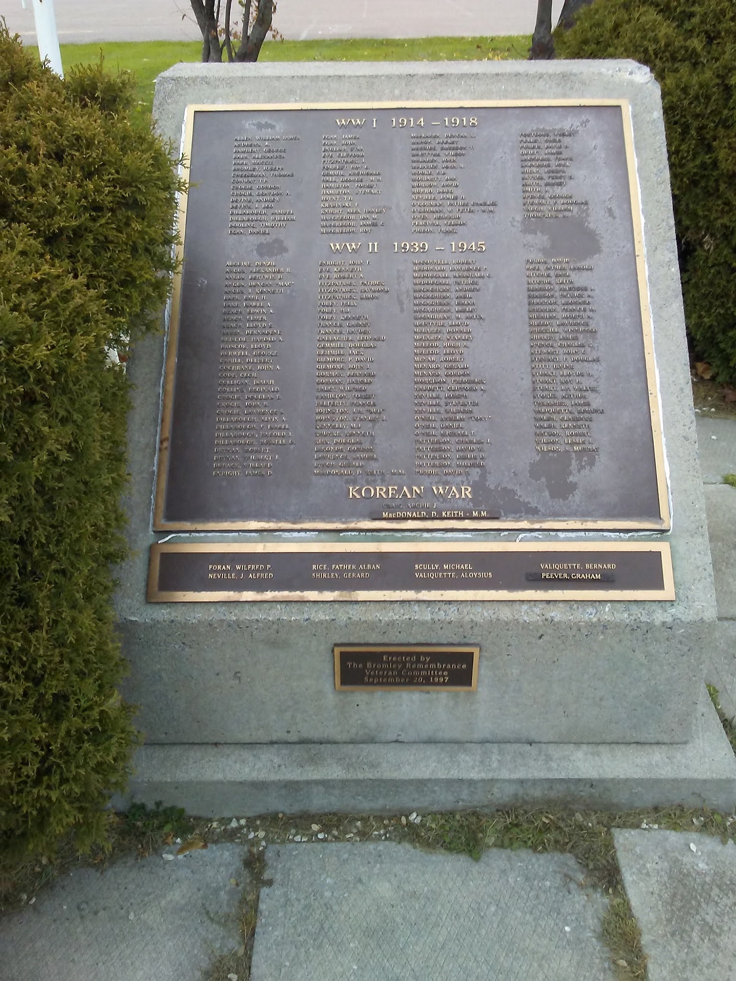 Ce mémorial est dédié aux hommes et aux femmes qui se sont battus pendant les Première et Seconde Guerres mondiales et la guerre de Corée. C’est le Comité du Souvenir du canton de Bromley qui l’a érigé en 1998.