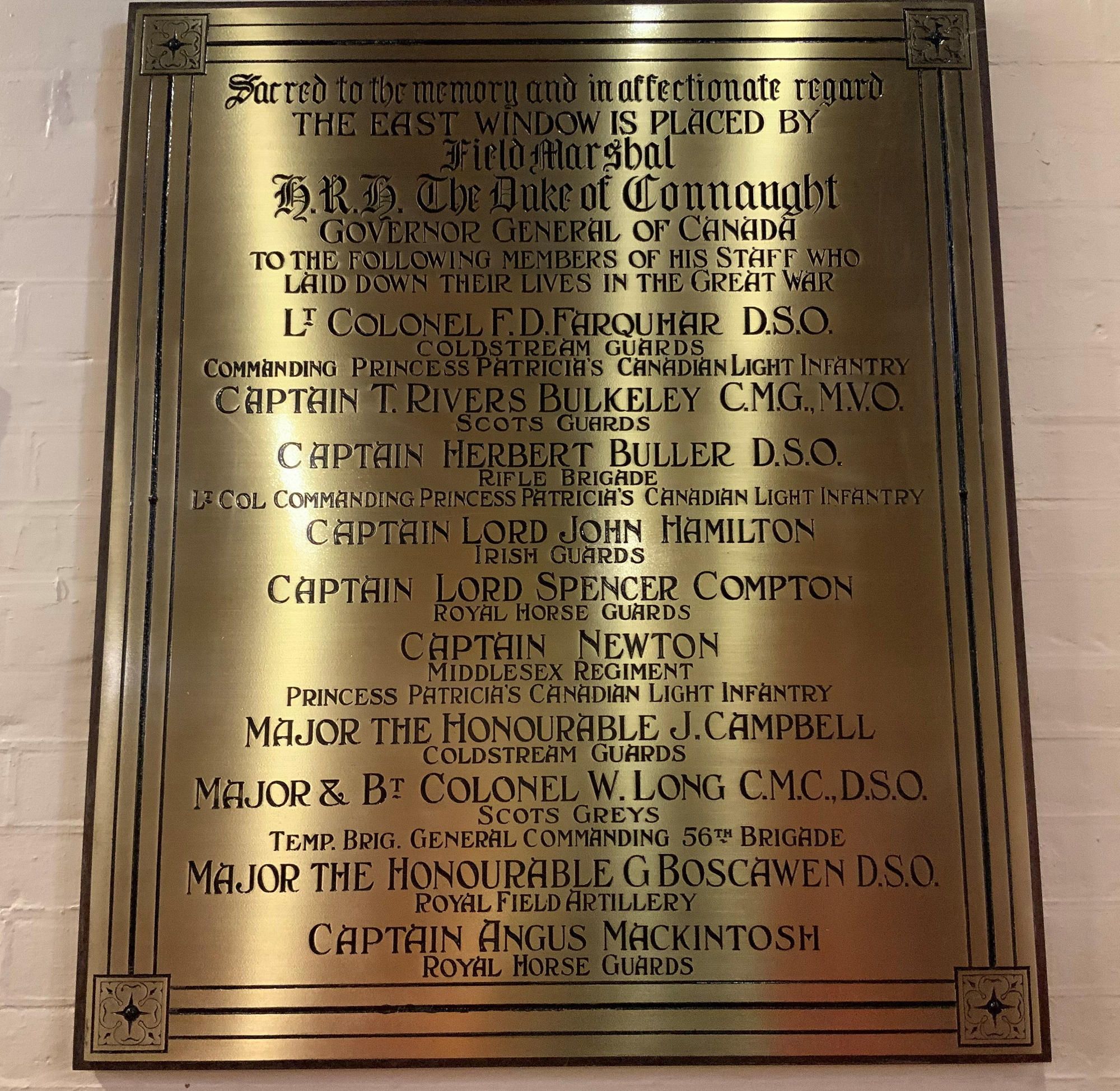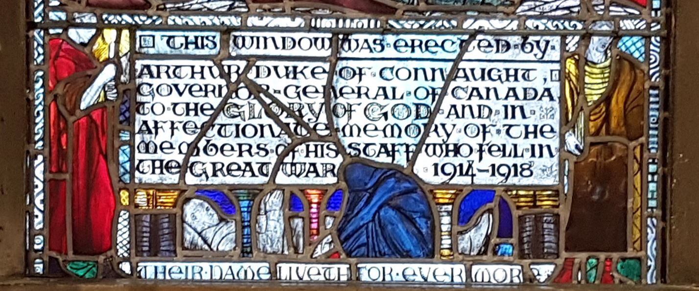 Le grand vitrail, dit vitrail d’Ottawa, a été commandé en 1916 par le prince Arthur, duc de Connaught, troisième fils de la reine Victoria, qui était à l’époque gouverneur général du Canada, en mémoire des membres de son personnel morts au combat au cours de la Première Guerre mondiale. Le vitrail a été commandé durant la guerre et il n’y avait aucune garantie que d’autres officiers ne seraient pas tués. Il a été décidé de ne pas inscrire leurs noms dans le registre inférieur du vitrail, mais plutôt d’installer une tablette distincte à proximité de celui-ci. Les noms des militaires honorés sont consignés sur une plaque de laiton sur le mur nord du sanctuaire.