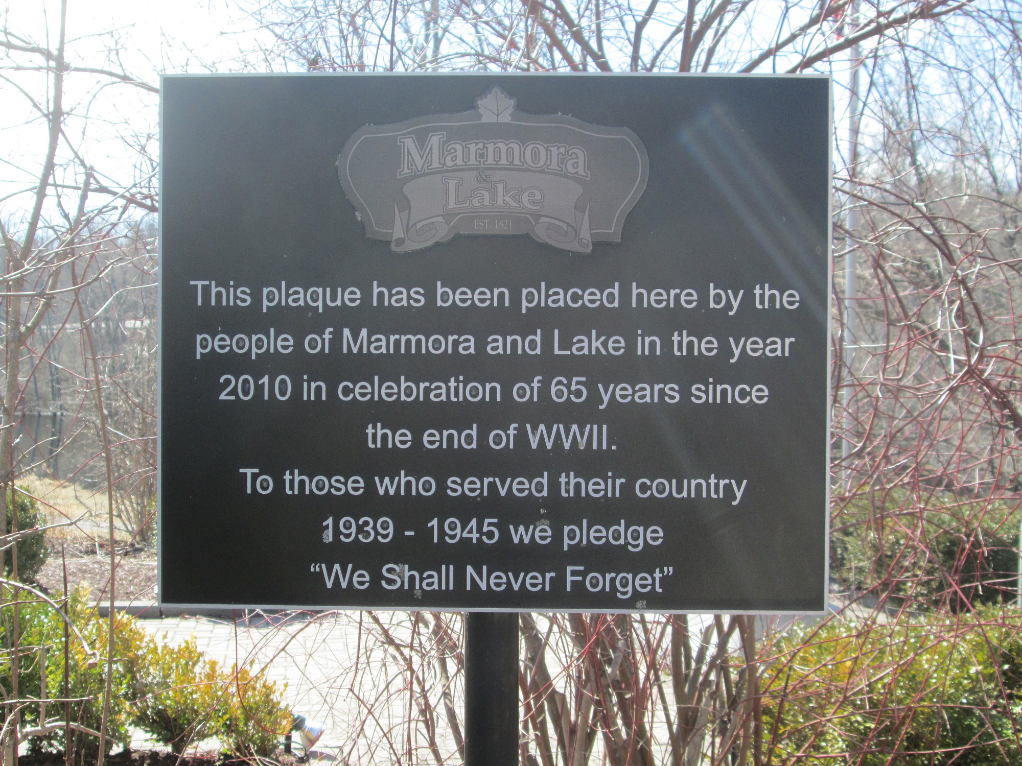 Cette plaque marque le 65e anniversaire de la fin de la Seconde Guerre mondiale. Elle est située dans l’aménagement horticole à droite du cénotaphe de Marmora.