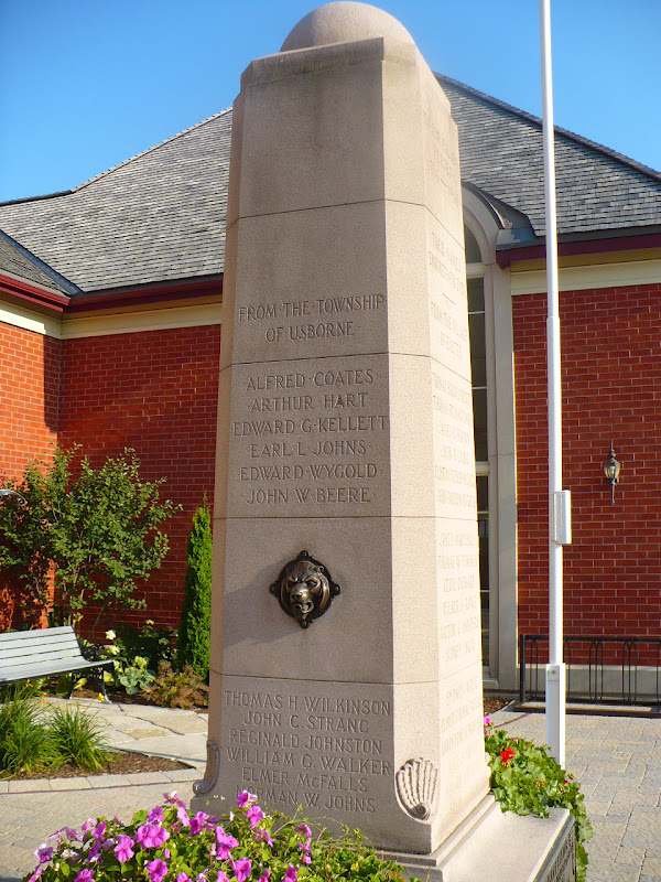 Le 9 janvier 1920, malgré le mauvais temps, une immense foule s’est rassemblée dans le village d’Exeter pour assister au dévoilement du monument commémoratif honorant les héros disparus du village d’Exeter et du canton d’Usborne. Les magasins, les usines et les manufactures avaient tous été invités à fermer leurs portes entre 15 et 16 heures ce jour-là. Le mémorial était à l’origine surmonté d’une colombe, mais de nombreux citoyens trouvaient que celle-ci n’évoquait pas vraiment à la colombe de la paix. Elle a donc été enlevée par le créateur du mémorial. Quand on regarde le monument depuis les fenêtres sud de la salle du conseil municipal, dans l’hôtel de ville d’Exeter, on peut voir la cicatrice laissée sur le dôme rond qui couronne le monument, à l’endroit où la colombe avait été fixée.
