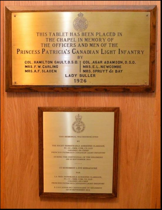 Les plaques de la Première Guerre mondiale du Princess Patricia’s Canadian Light Infantry ont été dévoilées pour la première fois en 1926 dans la chapelle du couvent des Moniales bénédictines de Mont-Laurier, situé sur la promenade Echo, de l’autre côté du canal Rideau, en face du parc Lansdowne. Les soldats catholiques du Princess Patricia’s Canadian Light Infantry se sont rassemblés dans la chapelle en août 1914 pour prier, alors qu’ils étaient cantonnés dans le parc Lansdowne. Des années plus tard, une congrégation sans église a utilisé la chapelle, et lorsque le couvent a fermé en 1984, les plaques ont été déplacées avec la congrégation.