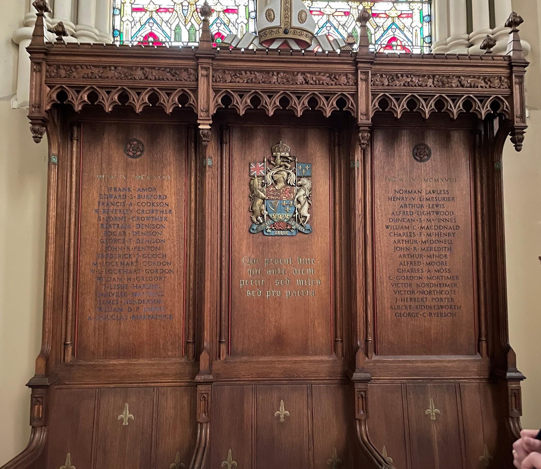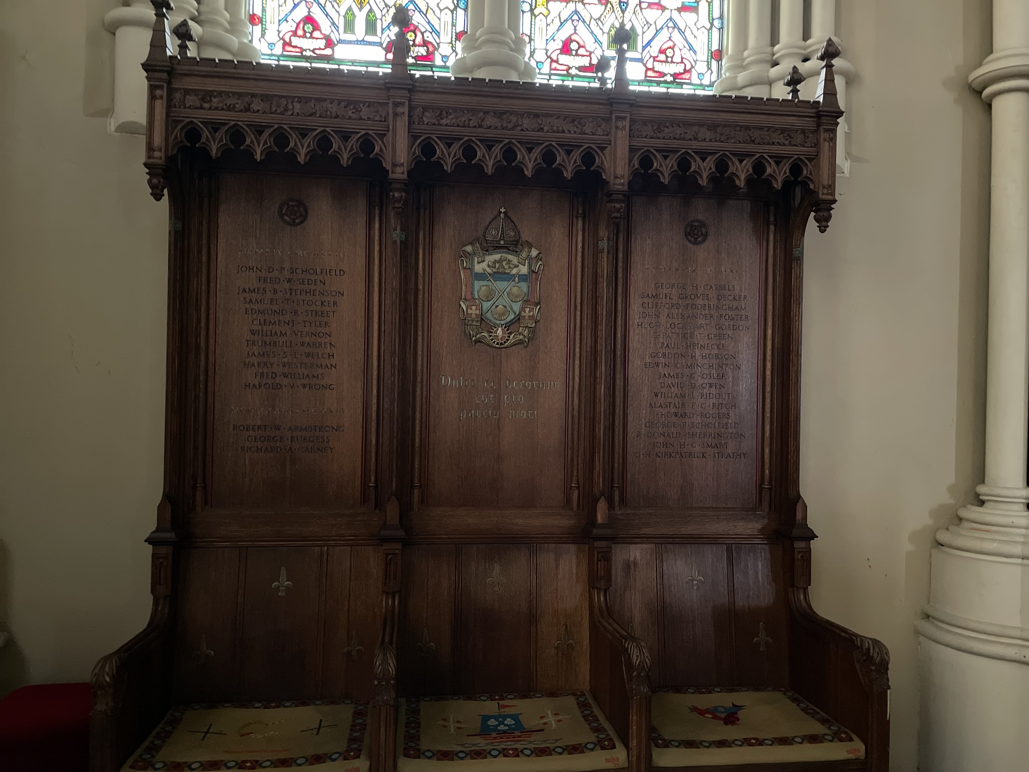 La sedilia gauche porte les armoiries canadiennes dans le panneau du milieu. Son inscription latine se traduit par « Avant le temps imparti, et loin de chez eux, ils sont morts, mais ils sont morts comme des soldats pour leur patrie ». La sedilia droite porte le dispositif héraldique de la cathédrale dans le panneau du milieu. Son inscription latine se traduit par « Mourir pour sa patrie est chose juste et appropriée ».